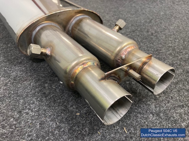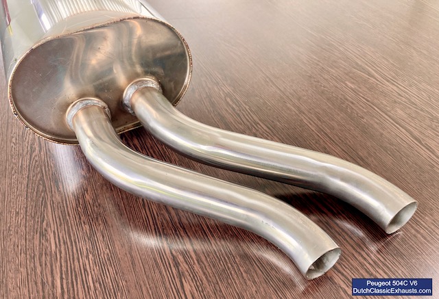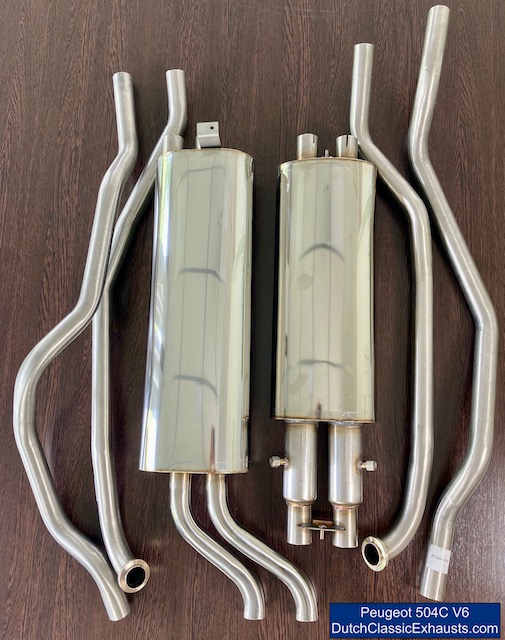 Complete RVS uitlaat voor de Peugeot 504 coupé en cabriolet, uitgerust met de machtige V6 Douvrin-motor (alle modellen). Uiteraard uitgevoerd met de elegante gelaste dubbele eindpijpen (gelast) en bovendien voorzien van een opnamepunt per cilinderbank op de tussendemper. Geleverd inclusief een montagebeugel (in RVS) voor montage van de achterdemper.